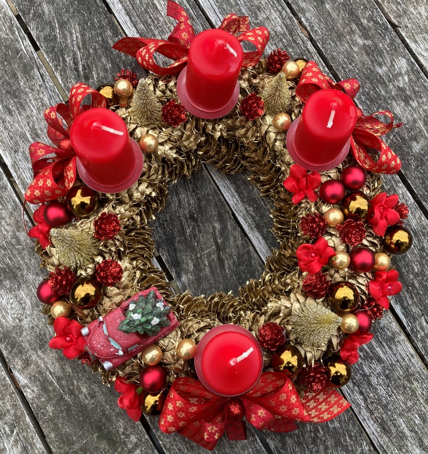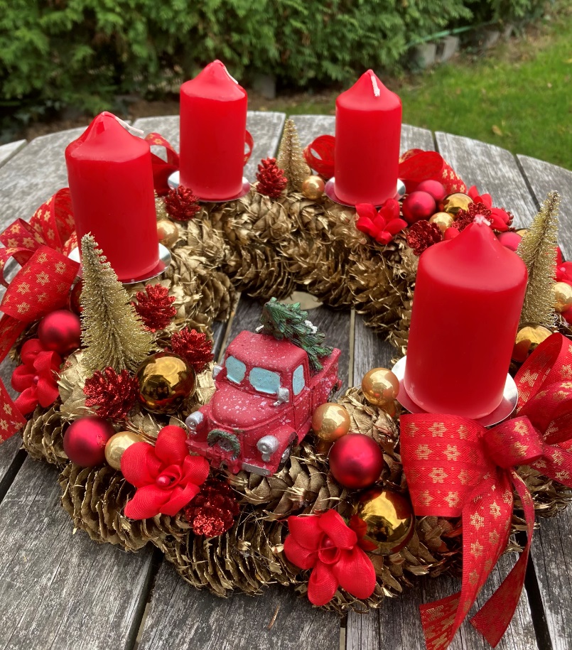 Adventní svícen s červeným autíčkem s vánočním stromkem a červenými svícemi, červené a zlaté doplňky