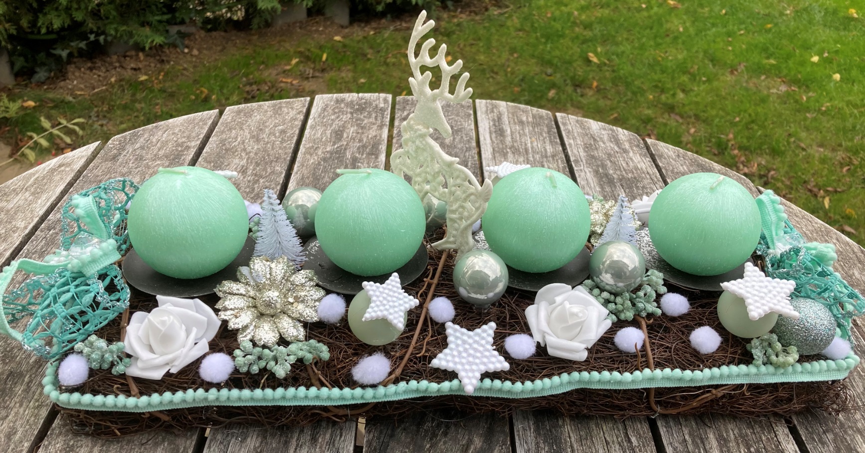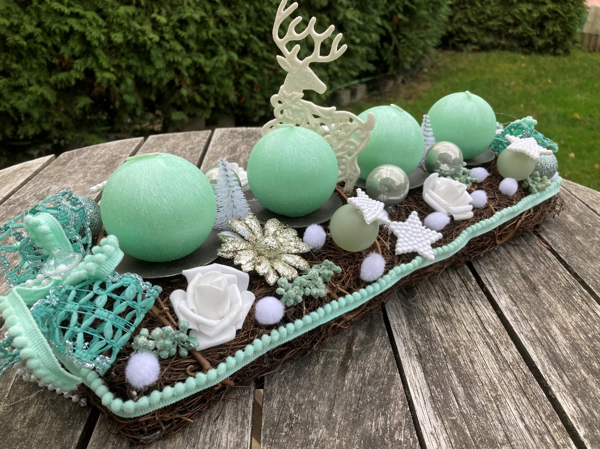 Adventní svícen o délce 44 cm, v mintové barvě s ústřední dekorací soba, doplněný umělými květy, ozdobami