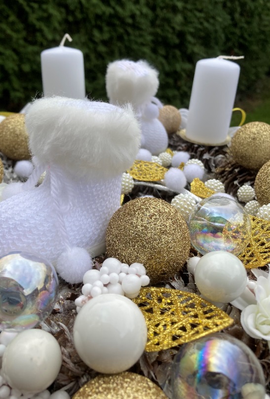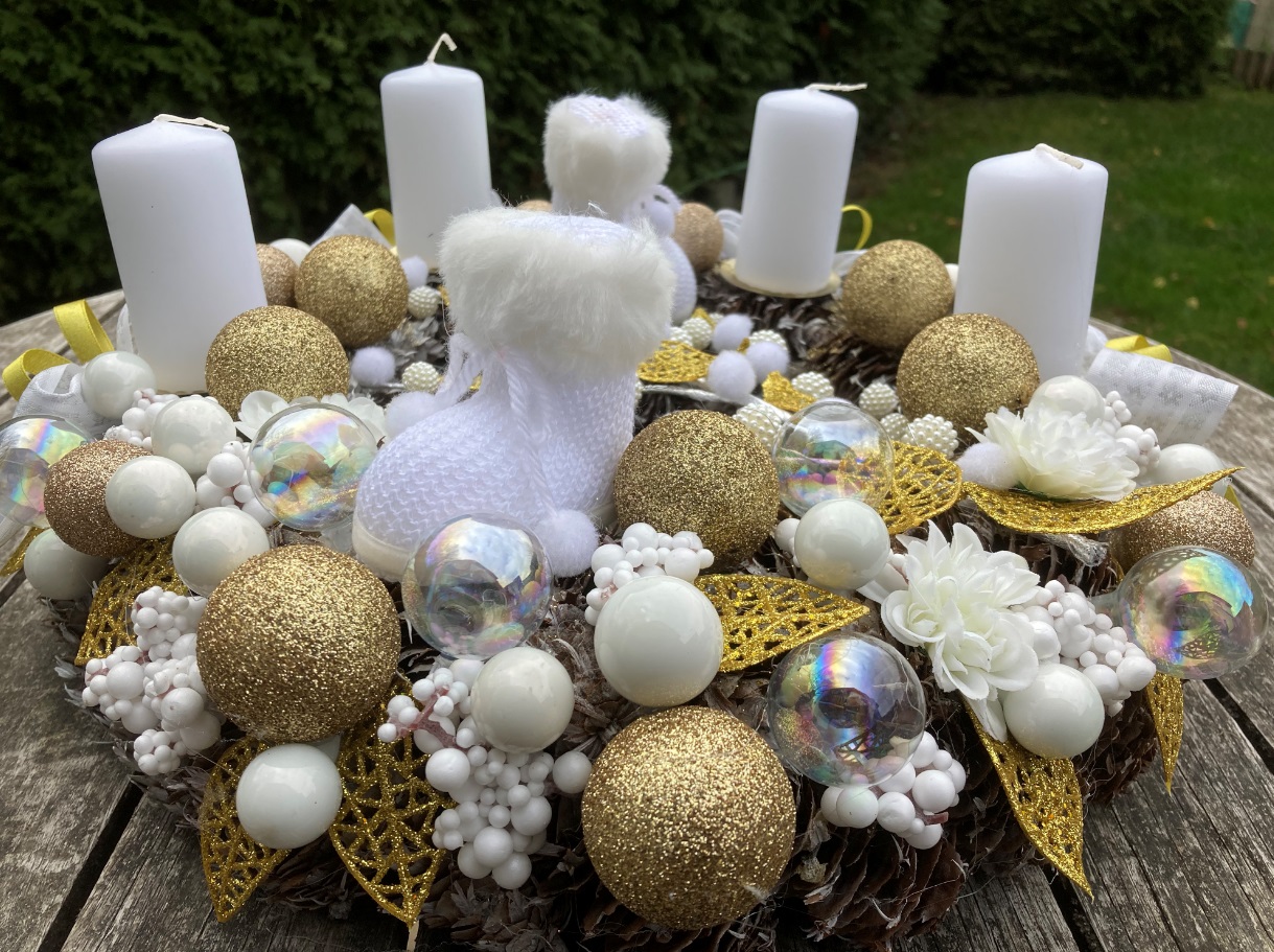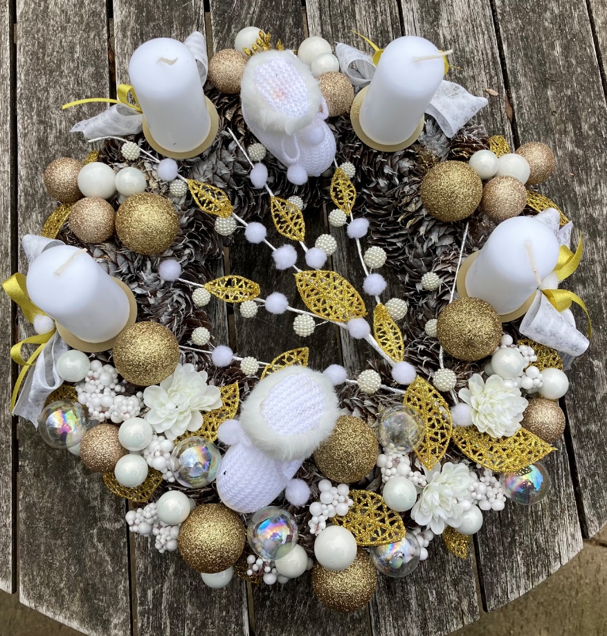 Zlatobílý adventní věnec se zlatými koulemi a sněhulemi.